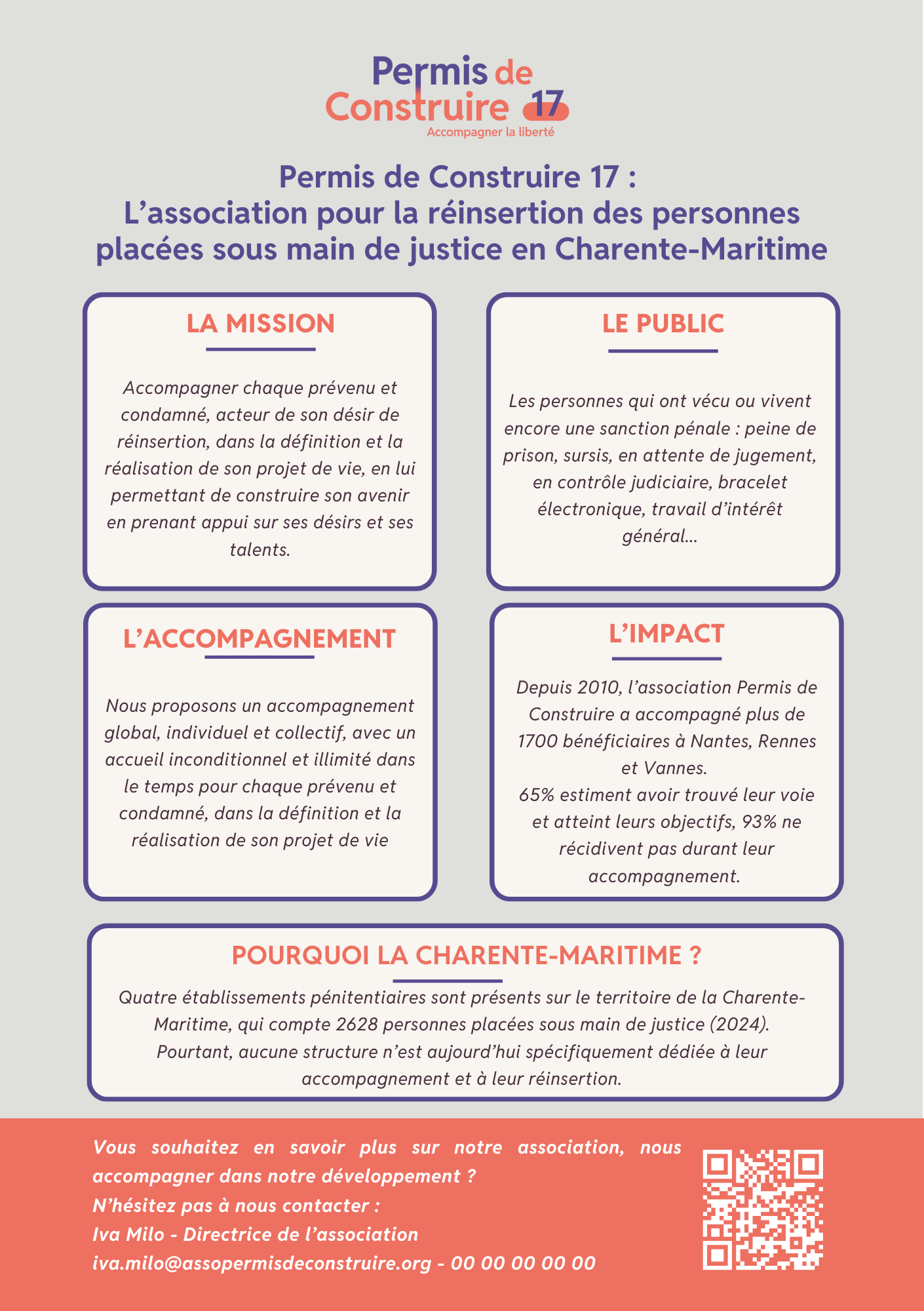 Permis de Construire 17 est une association récemment créée à La Rochelle en septembre 2025, dédiée à l’accompagnement des personnes placées ou passées sous main de justice dans leur parcours de réinsertion sociale et professionnelle.