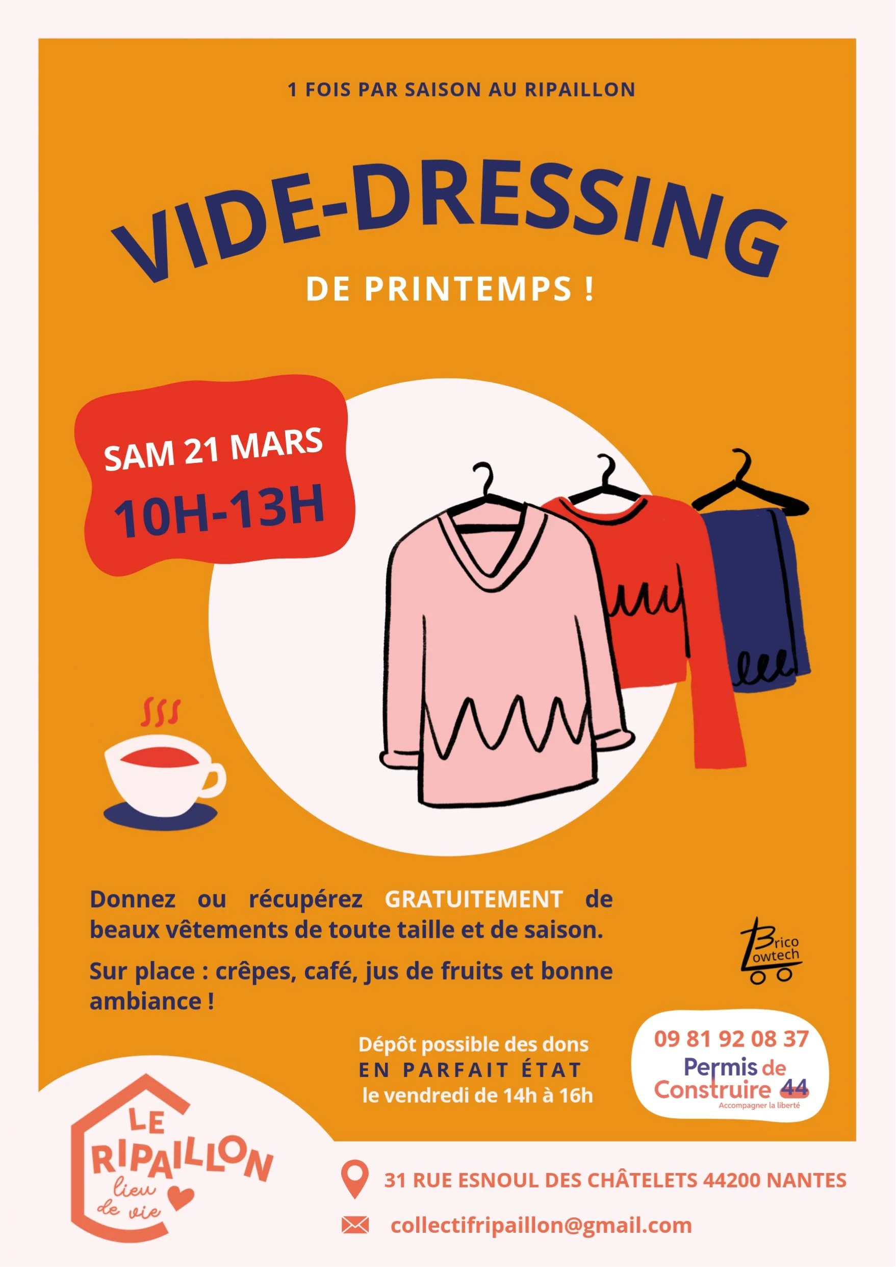 L’association Permis de Construire 44 vous invite à participer à son vide-dressing solidaire le samedi 21 mars au Ripaillon.